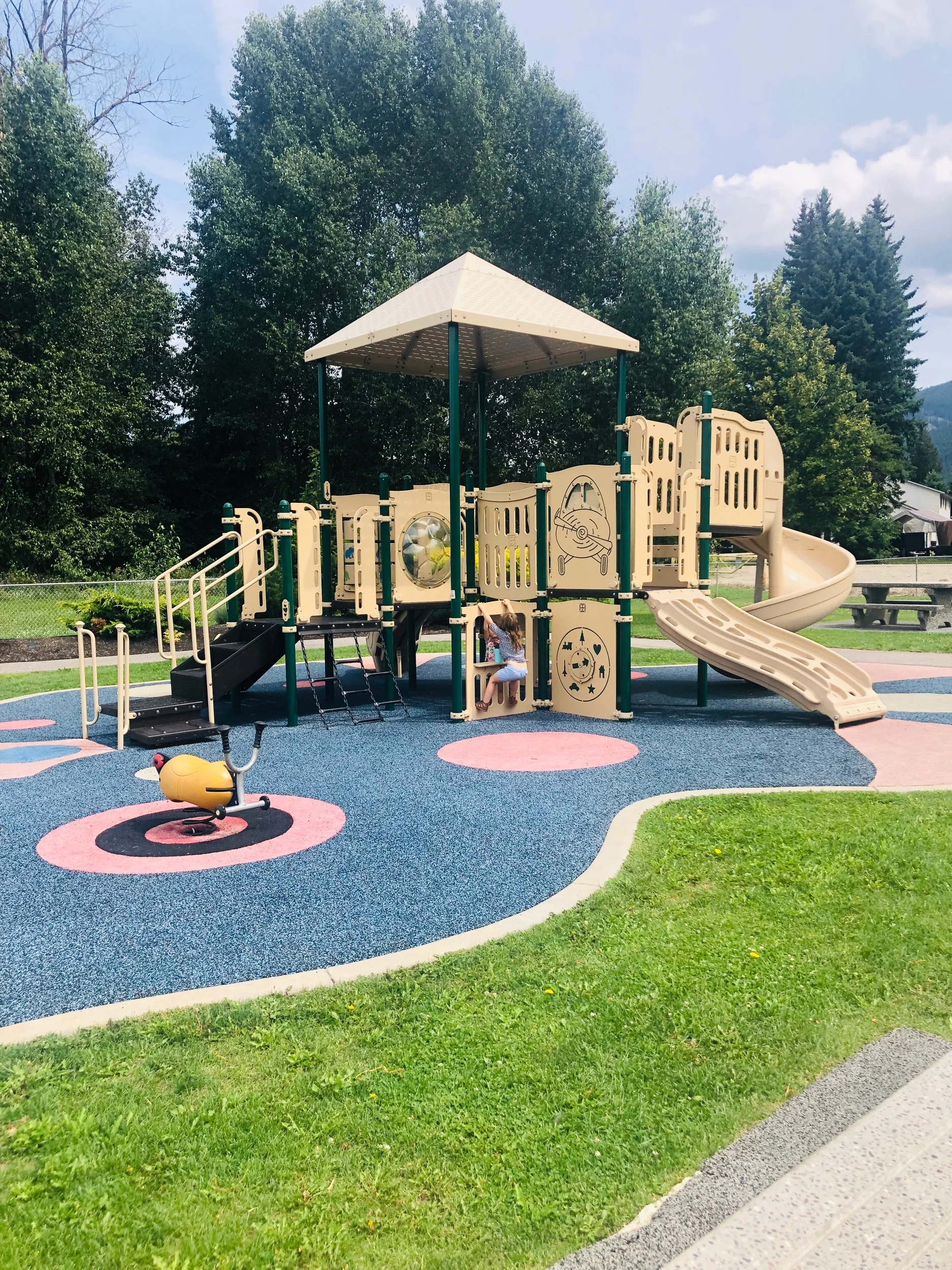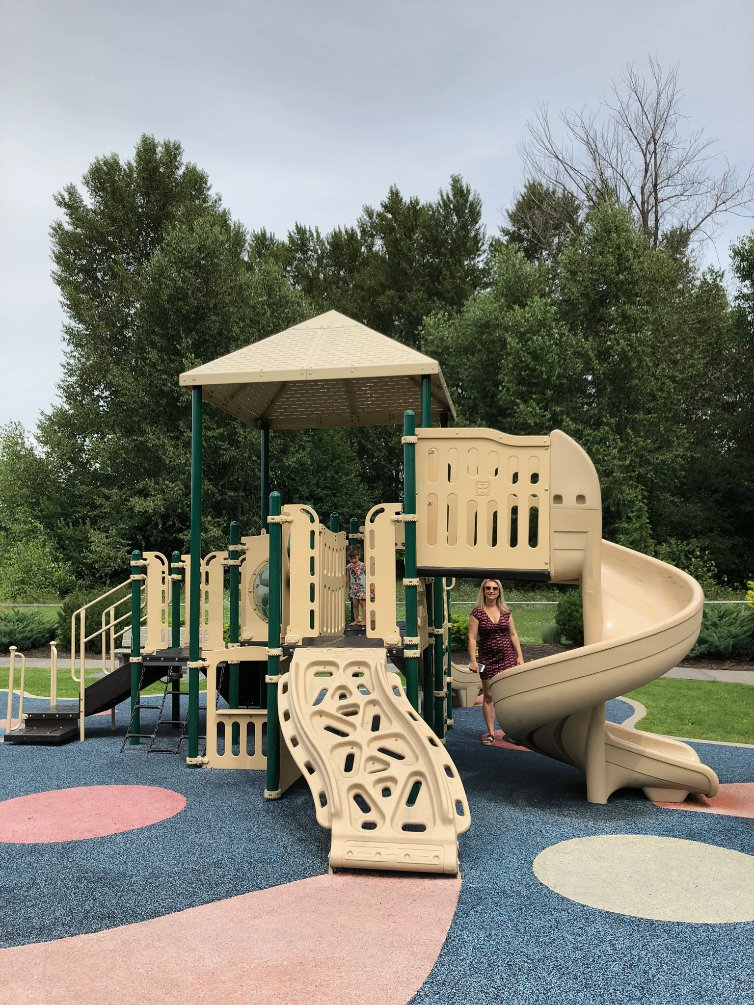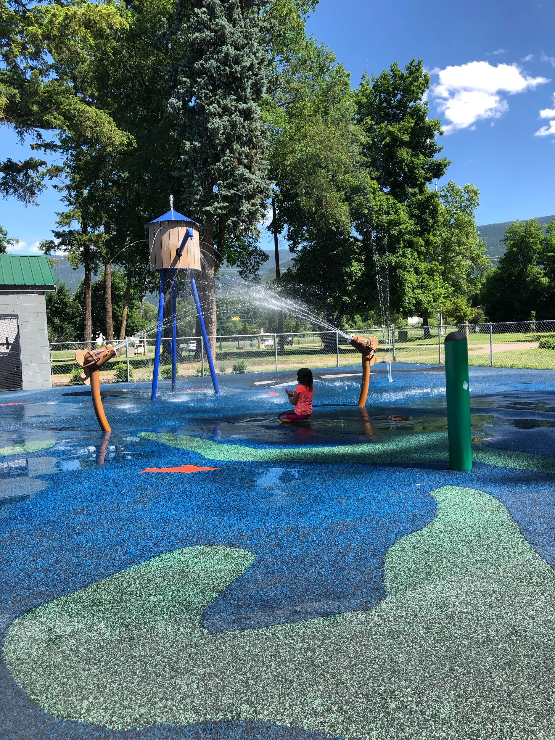 One of the absolute best parks around! You feel like a little fairy in an enchanted forest. Big trees, music playing, playground, outdoor exercise equipment, splash pad and pool.